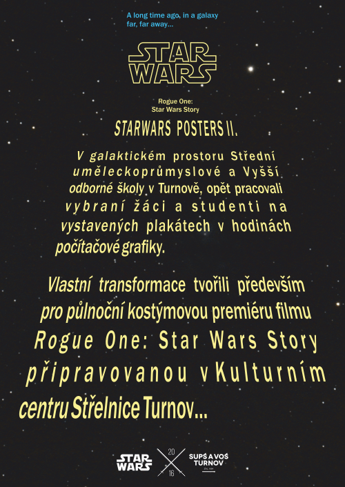 V galaktickém prostoru Střední uměleckoprůmyslové a Vyšší odborné školy v Turnově, pracovali již podruhé vybraní žáci a studenti na plakátech v hodinách počítačové grafiky. Vlastní interpretace tvořili pro půlnoční kostýmovou premiéru filmu Star Wars: Rogue One připravovanou v Kulturním centru Střelnice Turnov…