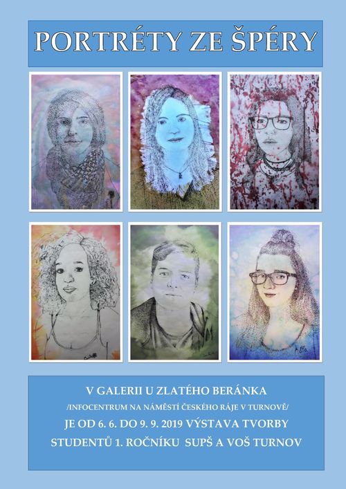 Studenti Střední uměleckoprůmyslové školy v Turnově v rámci výtvarné přípravy pod vedením p. uč. Evy Jiřičkové nakreslili tečkovací technikou své autoportréty. Studenti si vyzkoušeli kombinaci perokresby s koláží a malbou a své práce představují od 6. 6. v galerii U Zlatého beránka v turnovském informačním středisku do 9. 9. 2019.