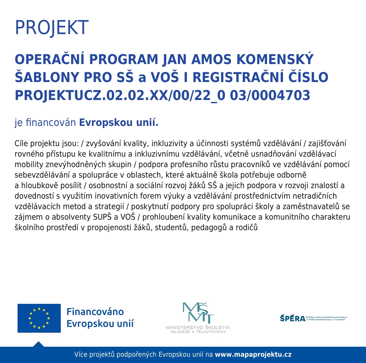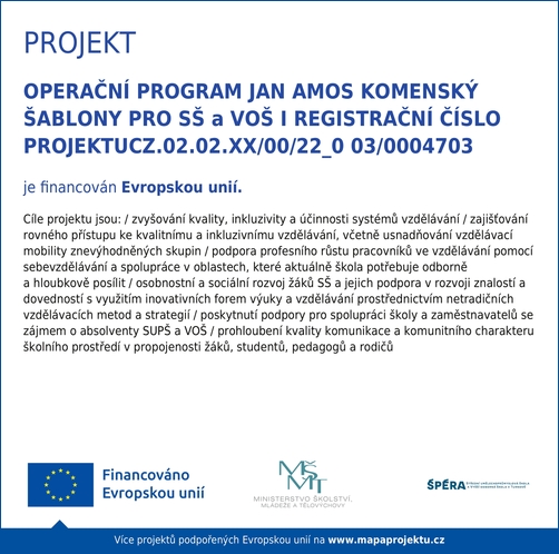 Opět na SUPŠ, VOŠ i Domově mládeže využíváme, díky finanční podpoře Evropské unie, možnost přispět k zajištění rovného přístupu ke kvalitnímu a inkluzivnímu vzdělávání pro všechny žáky a studenty prostřednictvím podpůrných personálních pozic, vzdělávání pracovníků škol a školských výchovných a ubytovacích zařízení, vzájemného sdílení zkušeností, spolupráce a podpory zavádění inovativních metod výuky.